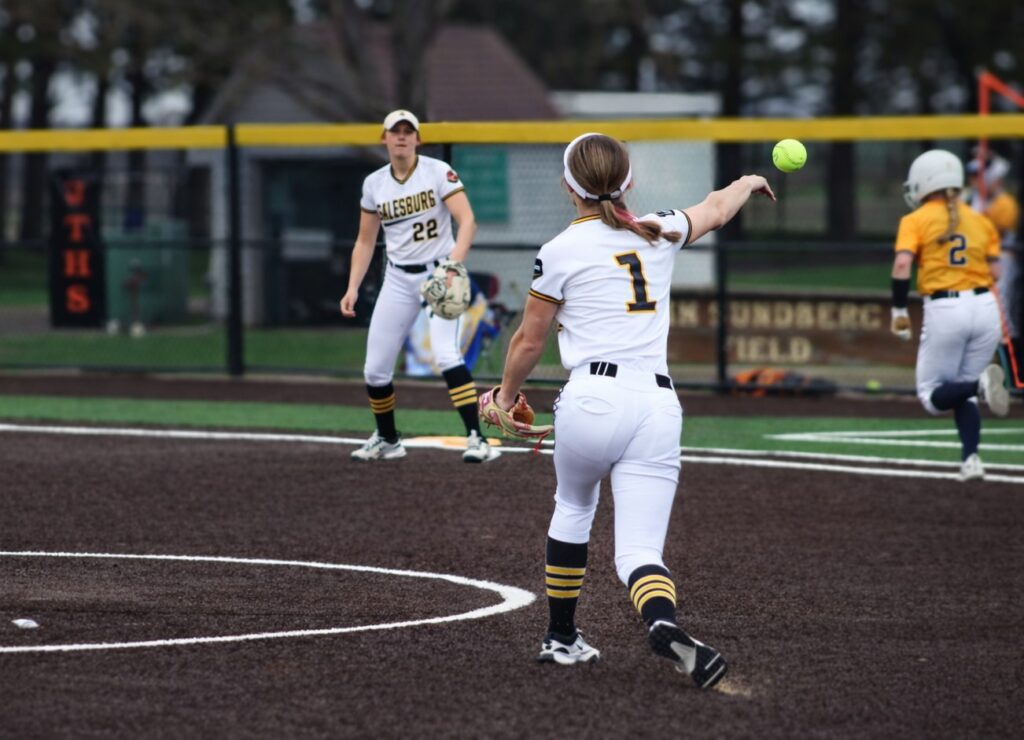 Galesburg third baseman Mavery Bland (1) throws to Avayah Bridgewater (22) to force out Sterling runner Madison Birdsley (2) during an April 9 game. (Photo by Loran Lewis/GCN)