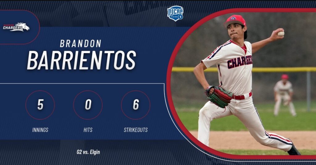 Brandon Barrientos delivered his best outing of the season Tuesday, throwing five hitless innings in relief as Carl Sandburg College played Elgin Community College to a 2-2 tie in the second game of a doubleheader called after 10 innings because of darkness.
