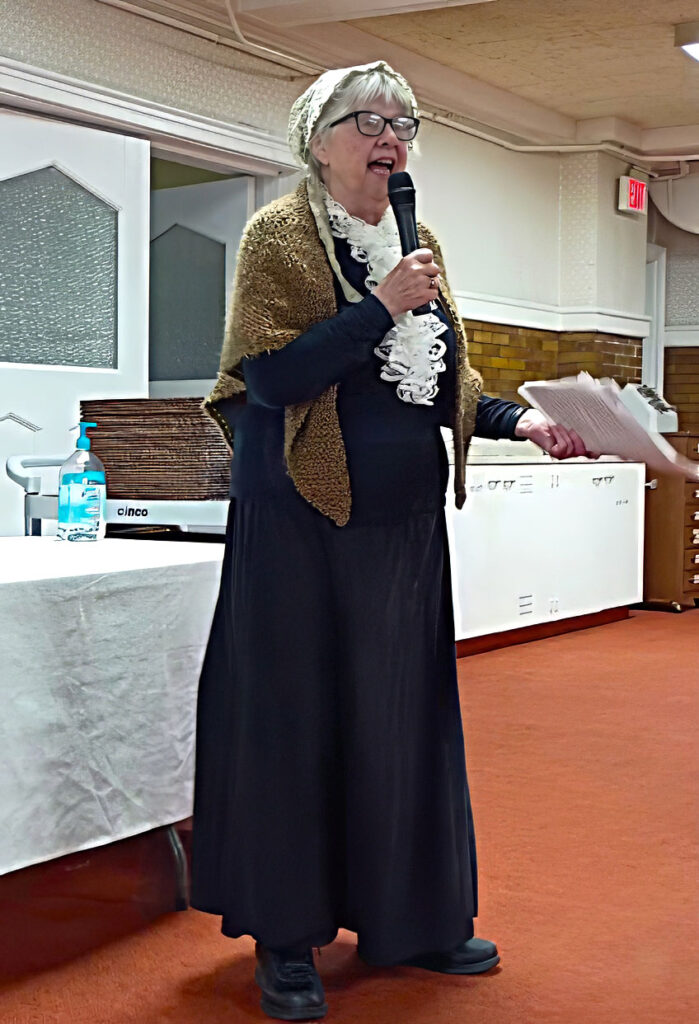 She first portrayed Mother Bickerdyke in 2004 at a Daughters of the American Revolution meeting in Galesburg and has continued ever since, speaking to civic groups and historical gatherings.