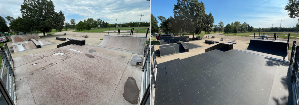 The park is used for skateboarding. Its ramps, bowls, and flat areas had cracked and warped due to weather and use, Simkins said. Of the approximately 8,000 screws, many had rusted, creating unsafe conditions and reducing use.