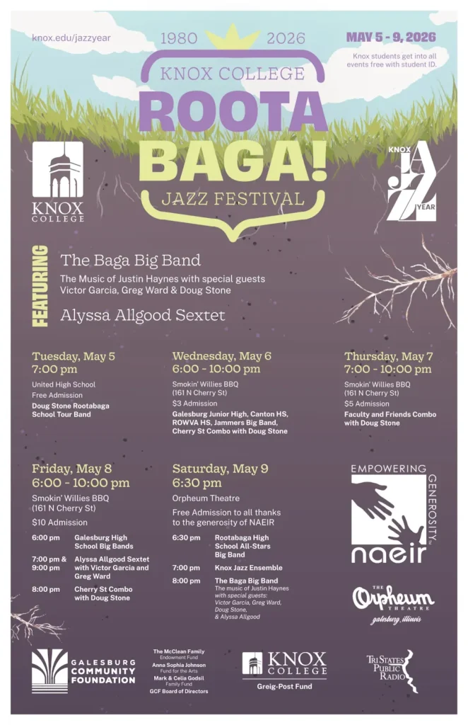 Knox College will host the 46th annual Rootabaga Jazz Festival May 5–9, featuring performances by student groups, regional high school bands and professional musicians at venues across Galesburg.