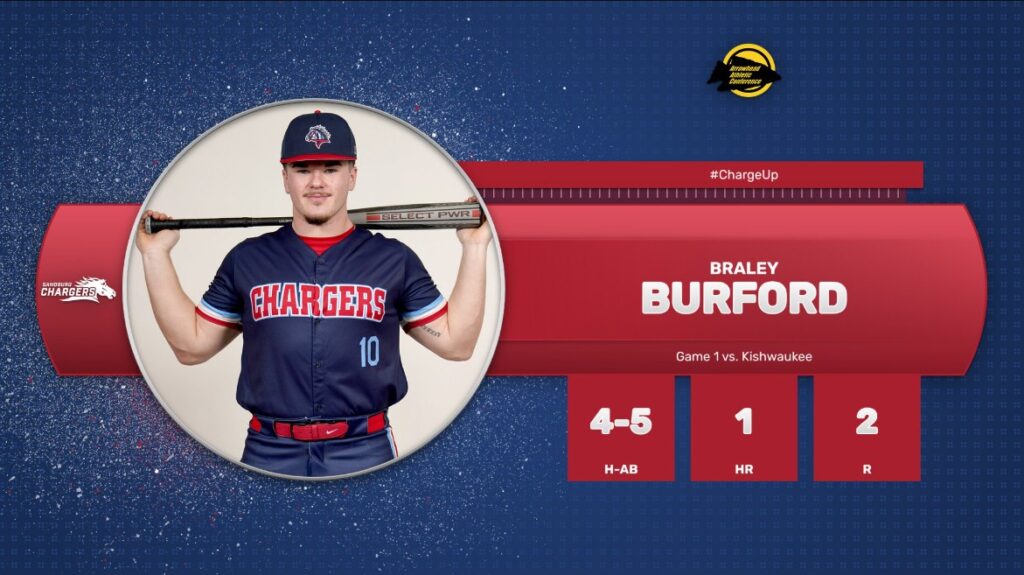 The Chargers rallied for a 13-11 win in the opener against Kishwaukee, using a six-run sixth inning fueled by three home runs from Braley Burford, Carter Ramsey and Chuck Hathaway. Burford finished 4 for 5.