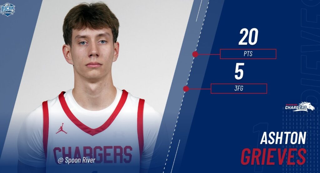 Sandburg’s Ashton Grieves scored 20 points, including five three-pointers, but the Chargers dropped their first game of the season to Spoon River. (Photo courtesy of Carl Sandburg College)