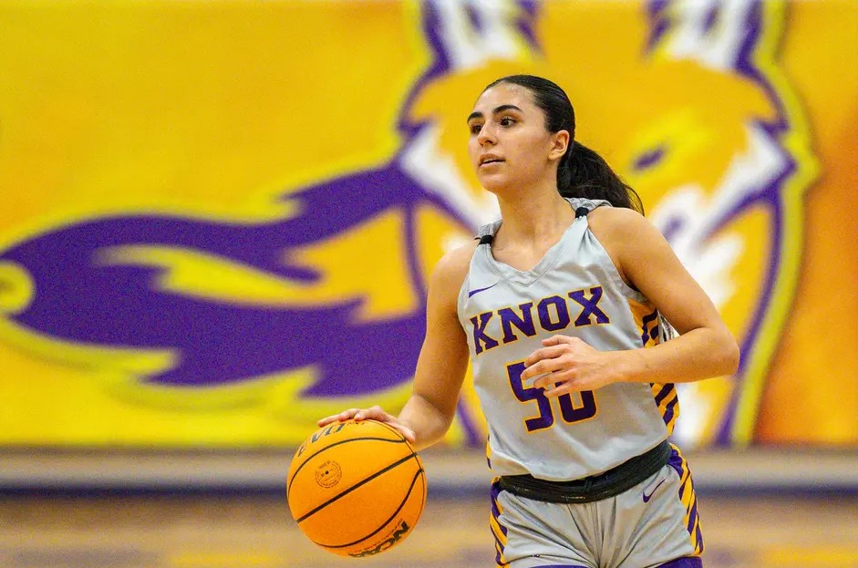 Bria Medina moved closer to becoming Knox College’s all-time scoring leader in women’s basketball, scoring 40 points against Illinois College. (Photo courtesy of Knox College)