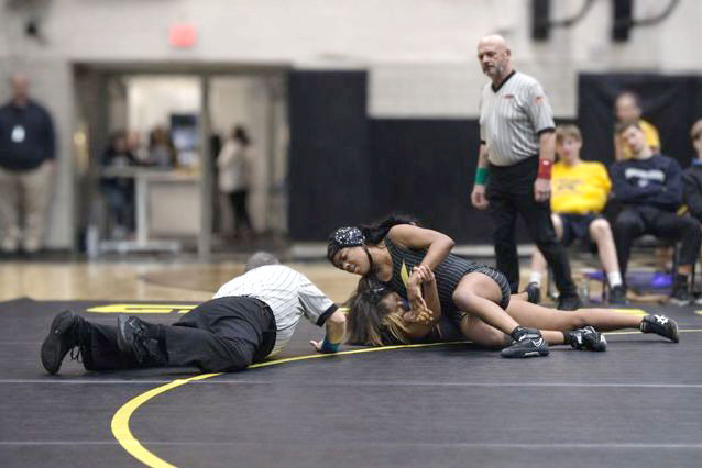 A referee prepares to call a pin as Silver Streak wrestler Jasmine Dillard applies the finishing touches. (Photo by Loran Lewis/GCN)