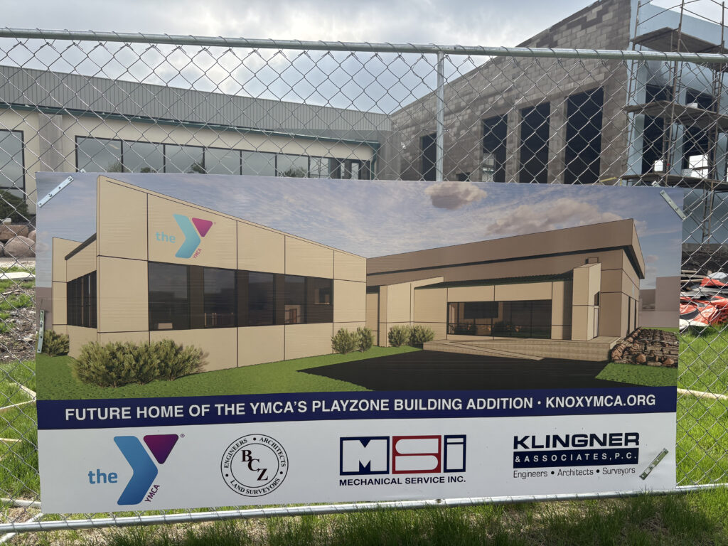 Construction is underway on an expansion at the Knox County YMCA, 1324 W. Carl Sandburg Drive. A rendering of the planned addition is displayed on a site sign. (Photo by Mike Trueblood/GCN)